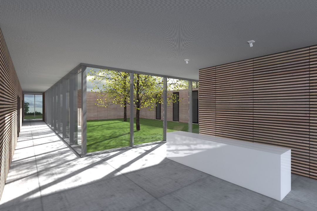Durch einen eingezogenen Bereich an der Nordwestecke des Gebäudes ist der Eingang intuitiv markiert. Nach dem barrierefreien Betreten erreicht man den Empfangsbereich, der eine übersichtliche und einfache Orientierung ermöglicht. Vielfältige Sichtachsen lassen den Besucher den Grundriss verstehen und geben über eine zu öffnende Verglasung im Osten den Blick auf die grüne Insel des Innenhofs frei.