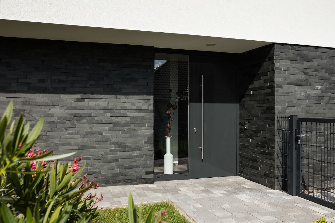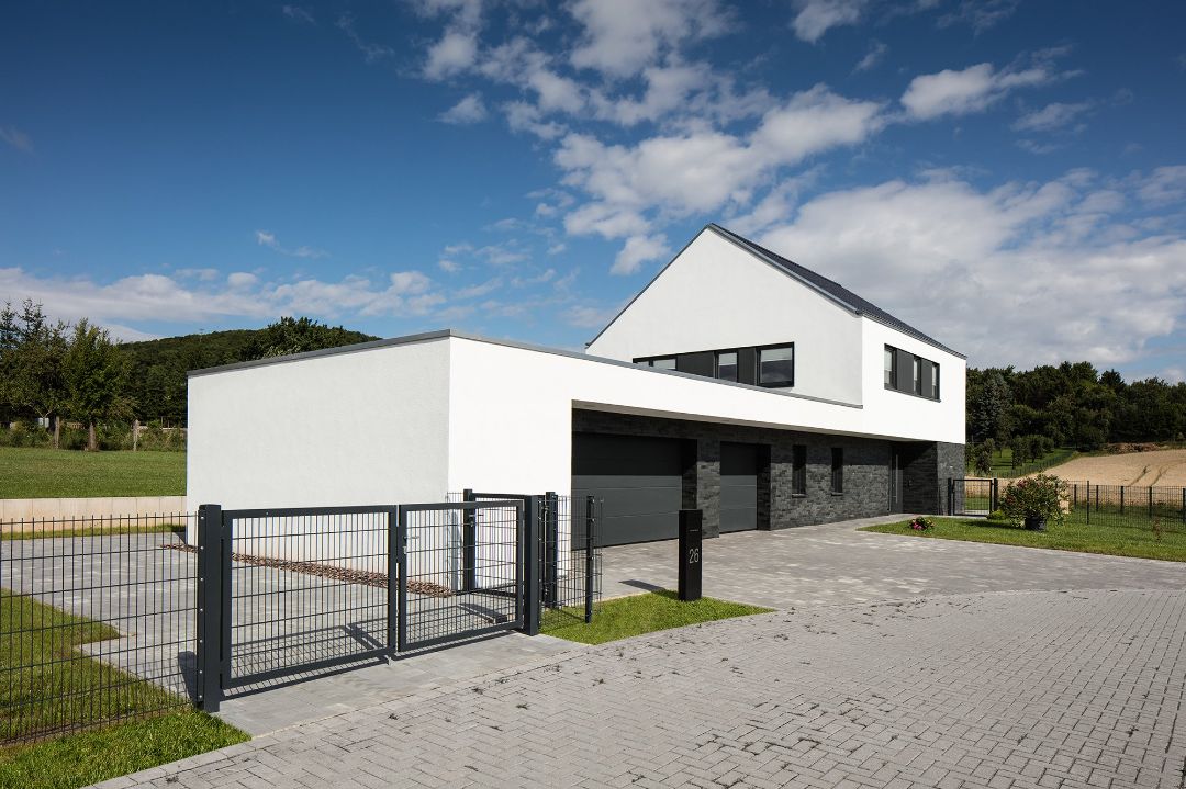 Neubau eines 2-geschossigen Wohnhauses mit direkt angrenzender Hofeinfahrt, Doppelgarage und Geräteraum. Die entlang der Straße angeordneten Funktionen lassen sich durchgängig von innen erschließen und schützen durch ihre lineare Struktur den Hof und die Terrasse als private Bereiche der Anlage. Das Niedrigenergiehaus erreicht den KfW-Effizienzstandard 70 und wird durch eine hocheffiziente Wärmepumpe mit Fußbodenheizung beheizt.