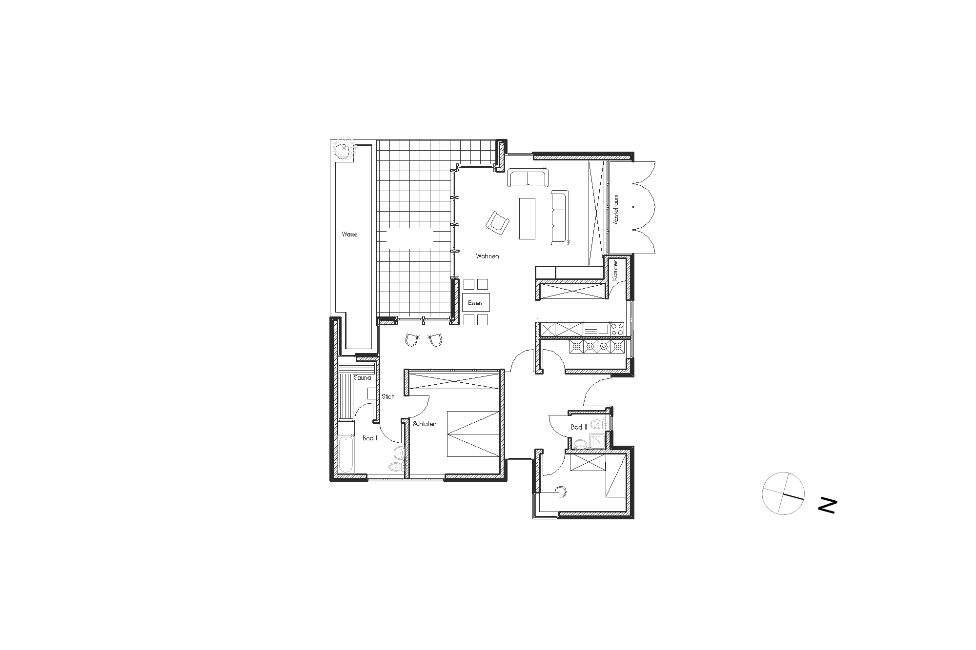 Ein gut organisiertes Bad mit angrenzender Sauna gestattet einen von außen geschützten Blick über das Wasserbecken in die Landschaft.