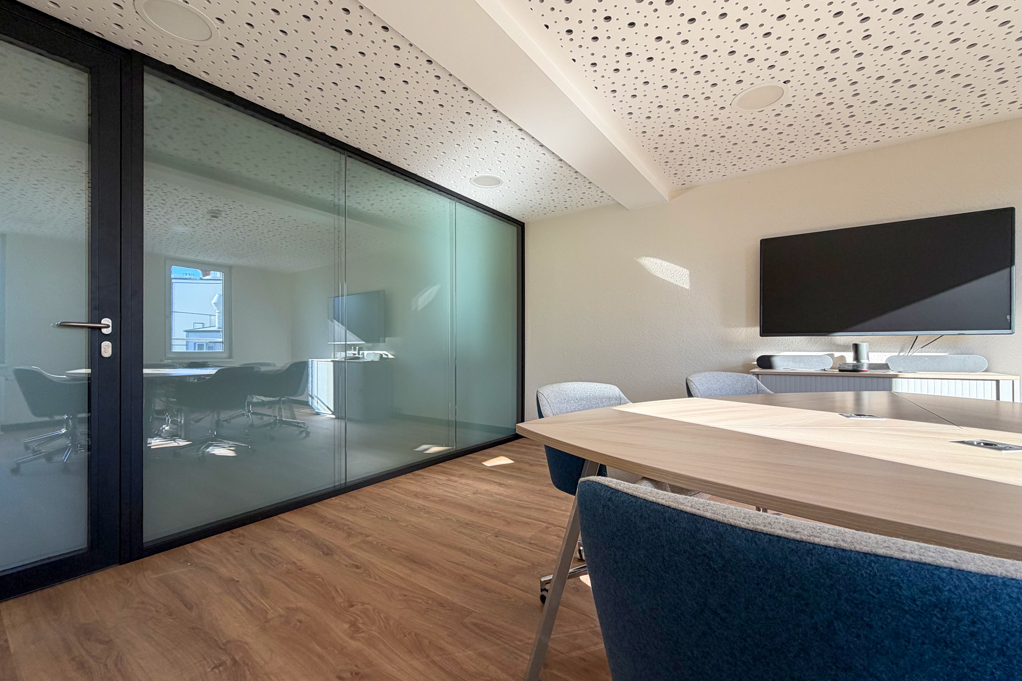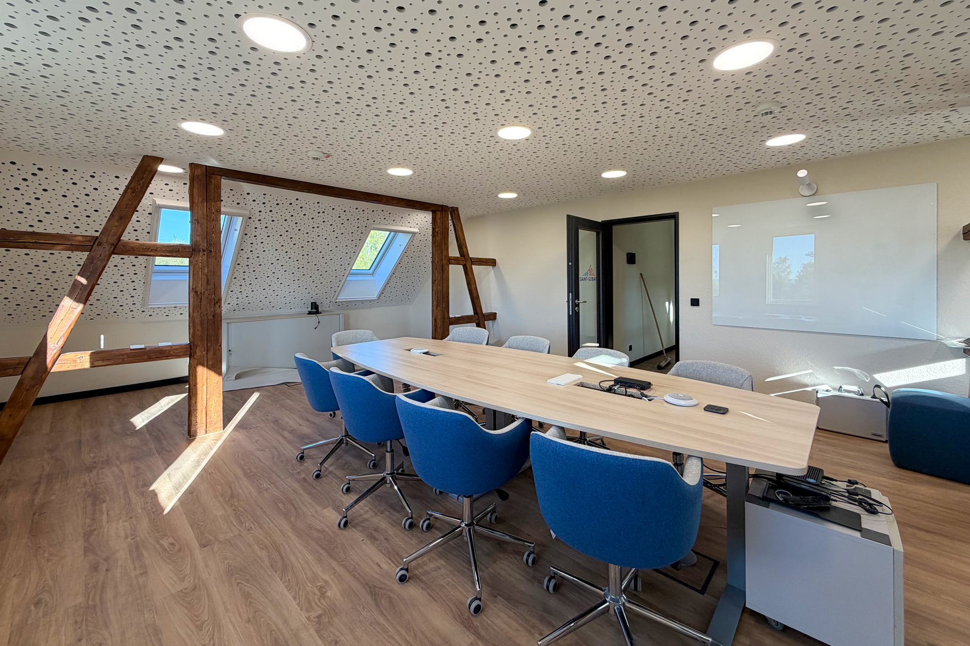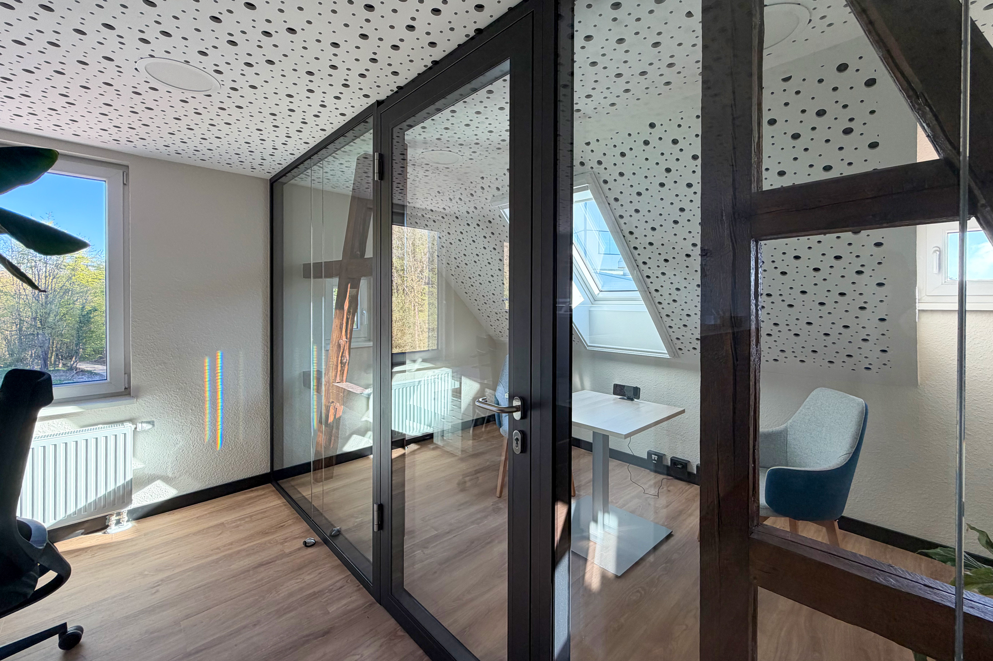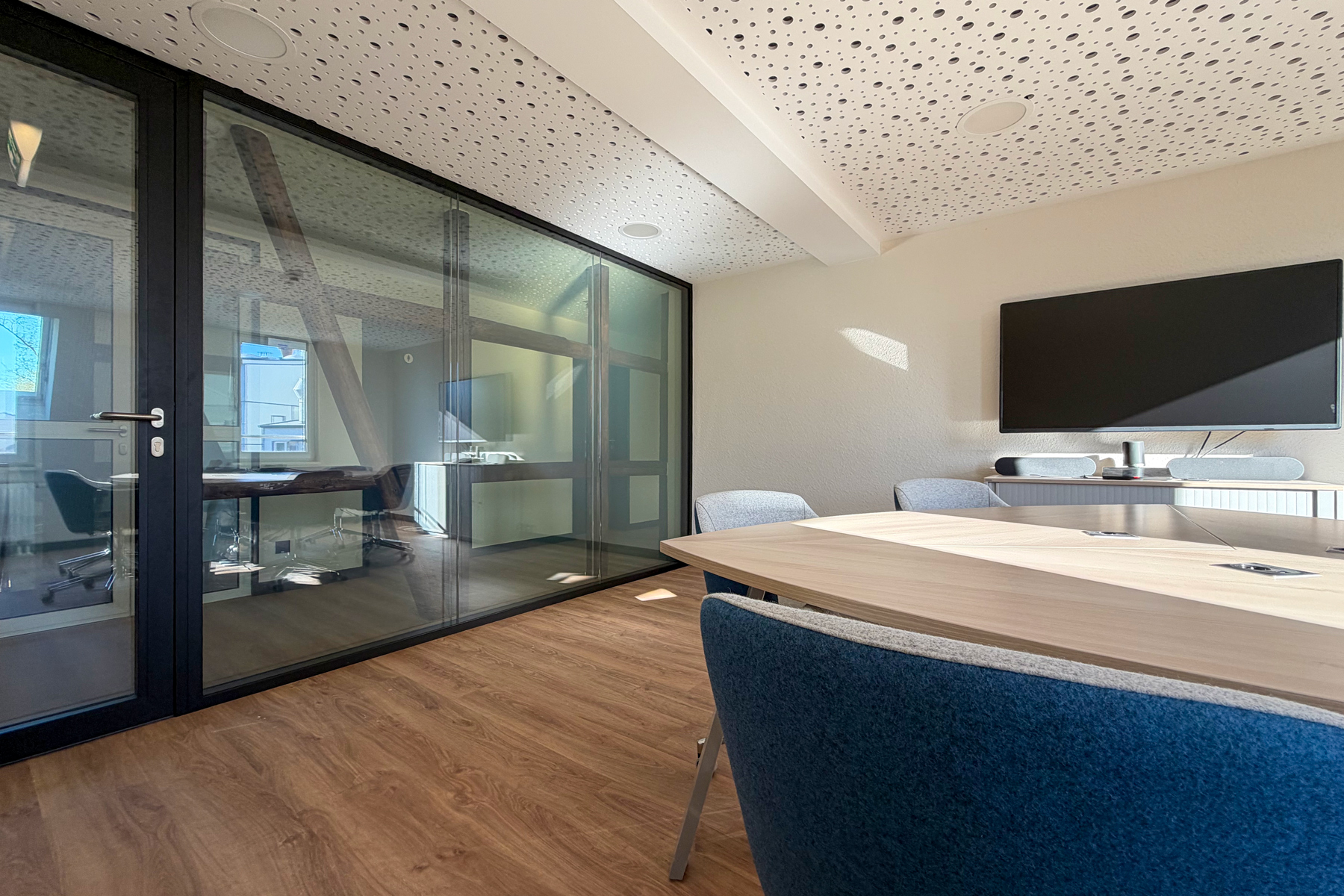 Zusätzlich wurde bei diesem Projekt im Besprechungsraum schaltbares Glas mit hohem Schalldämmwert eingesetzt, das per Knopfdruck zwischen transparent und undurchsichtig umschalten lässt. Die Fachwerkträger im Dachgeschoss wurden freigelegt und so eine Mischung aus historischer Architektur und moderner Nutzung erreicht.