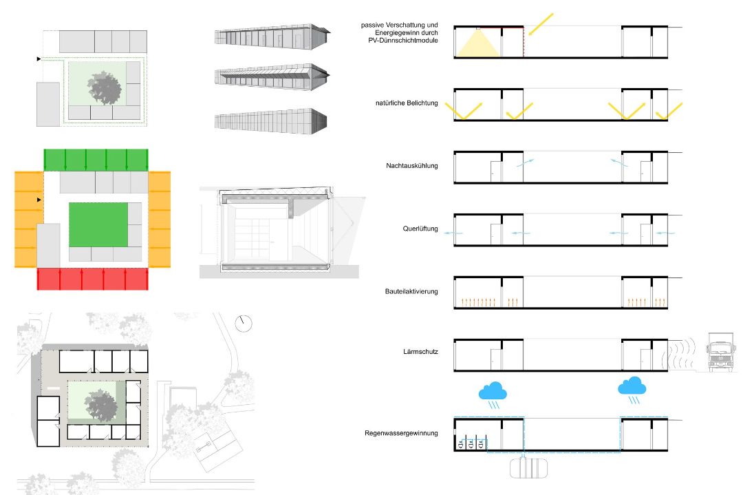 Die vor den Seminar- und Büroräumen angeordneten Pufferzonen sowie der Baumbestand im Innenhof ermöglichen die passive Verschattung des Gebäudes und helfen, den Jahresenergiebedarf zu minimieren. Im Winter oder in der Übergangszeit können die Faltläden geöffnet und über die Bauteilaktivierung der Innenflächen solare Gewinne realisiert werden. Vor den verglasten Flächen angeordnete flache Wasserbecken dienen als adiabate Kühlung in den Sommermonaten. Es ist denkbar, das Material der Faltläden mit aufgedampften Photovoltaikmodulen auszustatten und hierüber Gewinne zu erzielen, da der typische Öffnungswinkel der Verschattung mit dem im Jahresverlauf veränderten Sonnenstadt korrespondiert. Der ruhige und geschützte Innenhof ermöglicht eine energieeffiziente Nachtauskühlung des Gebäudes in den Sommermonaten über eine einfache Kippfunktion der Verglasung. Bewegungsmelder sichern dabei den Innenraum ab und schließen die Flügel, sobald hier unberechtigter Zutritt erfolgt.