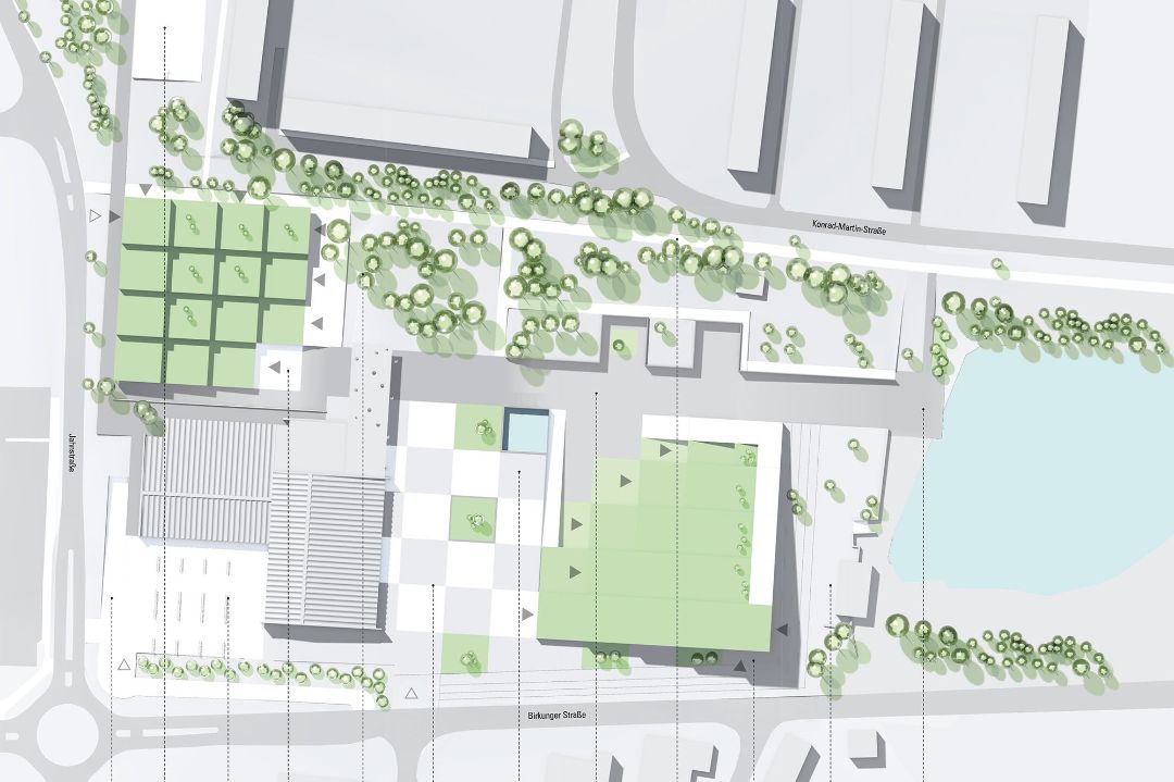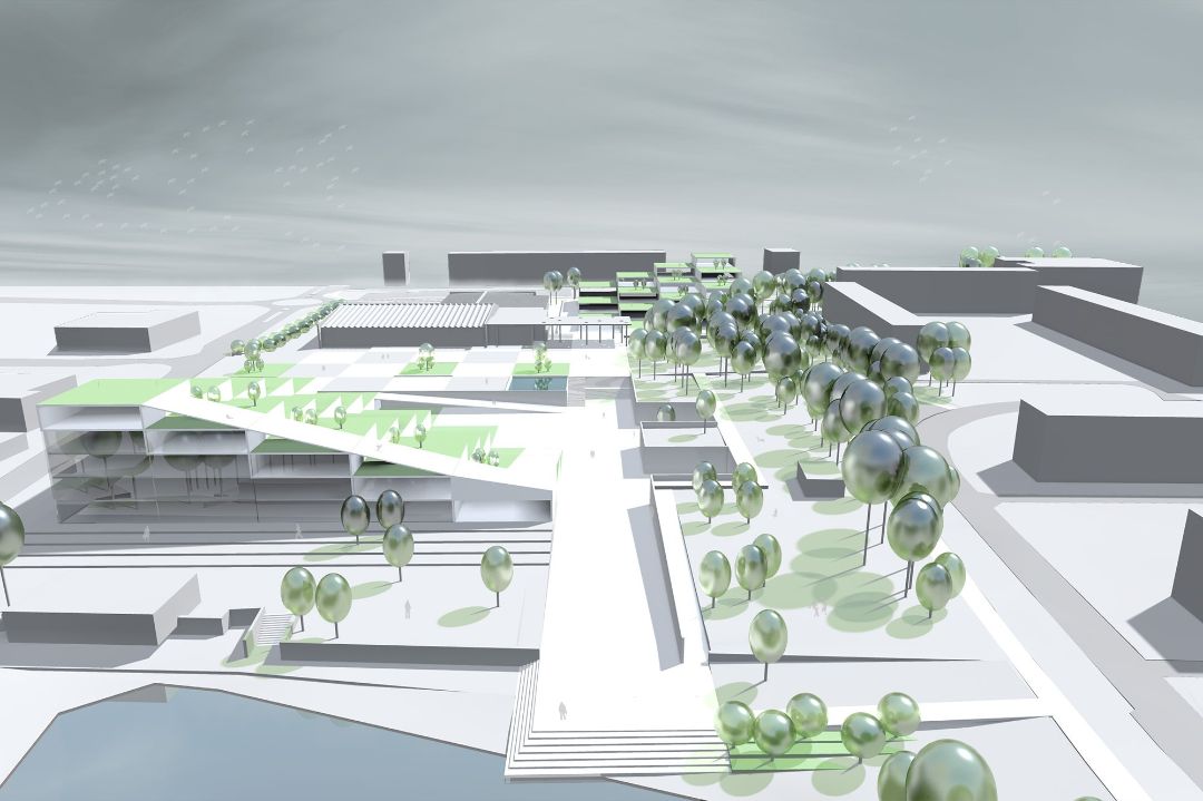 Die im Entwurf vorgeschlagene Platzgliederung verringert zum Teil den bisherigen Versiegelungsgrad des Areals und führt mit dem Anlegen von zentralen Wasser- und Grünflächen zu einer Verbesserung des Mikroklimas sowie der Aufenthaltsqualität der neuen Mitte. Die geplanten Gebäudeformen mit durchgängiger, terrassierter Dachbegrünung halten anfallendes Niederschlagswasser zurück, entlasten damit die öffentlichen Netze und führen durch die dämmenden Eigenschaften begrünter Dächer, neben einem hohen Nutzwert, zu einer effizienten Energieeinsparung.
