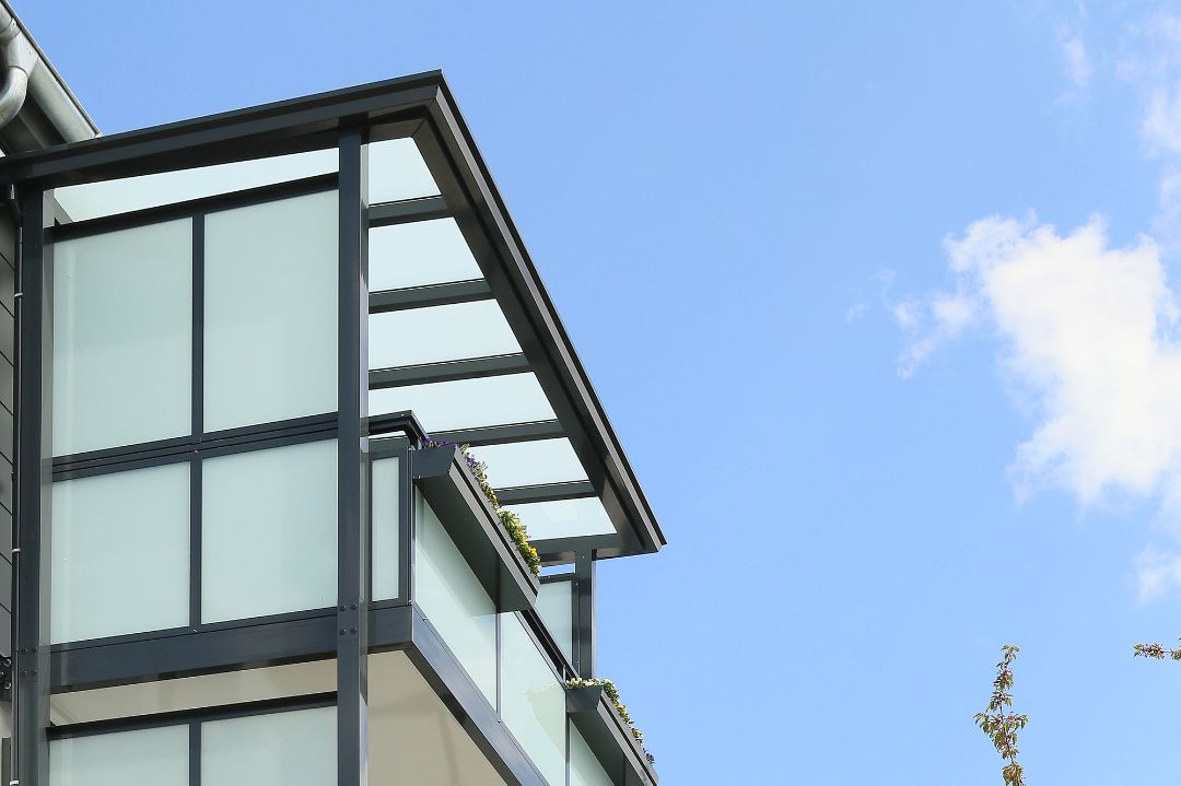 Harmonische Farbreihen und eine klare Absetzung des Sockelbereichs helfen den Maßstabsbruch mit der Umgebung abzumildern. Das mit großformatigen Faserzementplatten verkleidete 3. Obergeschoss wirkt optisch als Dach und nähert sich damit den örtlichen Proportionen. Die Flächen zwischen den Fenstern nehmen regional typische Farben auf und verbinden den Baukörper mit dem Ort.