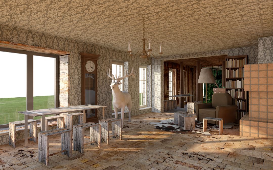 So werden die Räume im Erdgeschoss in verschiedene Themenbereiche (Märchenhaus, Hexenkessel und Zauberwald) gegliedert. Dem jeweiligen Schwerpunkt entsprechend werden natürliche Oberflächenmaterialien eingesetzt und die Ausstattung den drei Themenbereichen angepasst, um so individuelle Erlebnisräume zu schaffen.