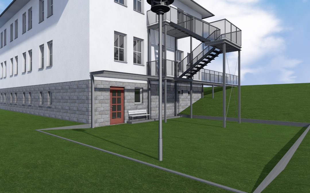 In einem zweiten Bauabschnitt soll die Eingangssituation mit einem Pavillon neu geordnet werden. Der Entwurf versteht sich dabei als bewusste Weiterentwicklung der vorhandenen Stahl-Treppenanlage, ergänzt sie jedoch mit ortsüblichen Materialien und Motiven. Dieser Bereich dient als klar erkennbarer Eingang, verbessert über ein großes Fenster die Belichtungssituation, erweitert das Sitzplatzangebot und schafft im Sommer mit seiner Außenterrasse zusätzliche Gästeplätze.