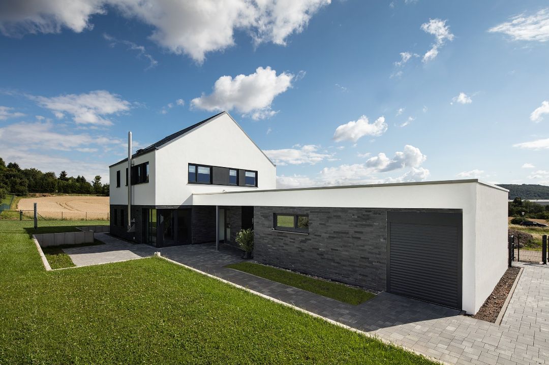 Neubau eines 2-geschossigen Wohnhauses mit direkt angrenzender Hofeinfahrt, Doppelgarage und Geräteraum. Die entlang der Straße angeordneten Funktionen lassen sich durchgängig von innen erschließen und schützen durch ihre lineare Struktur den Hof und die Terrasse als private Bereiche der Anlage. Das Niedrigenergiehaus erreicht den KfW-Effizienzstandard 70 und wird durch eine hocheffiziente Wärmepumpe mit Fußbodenheizung beheizt.