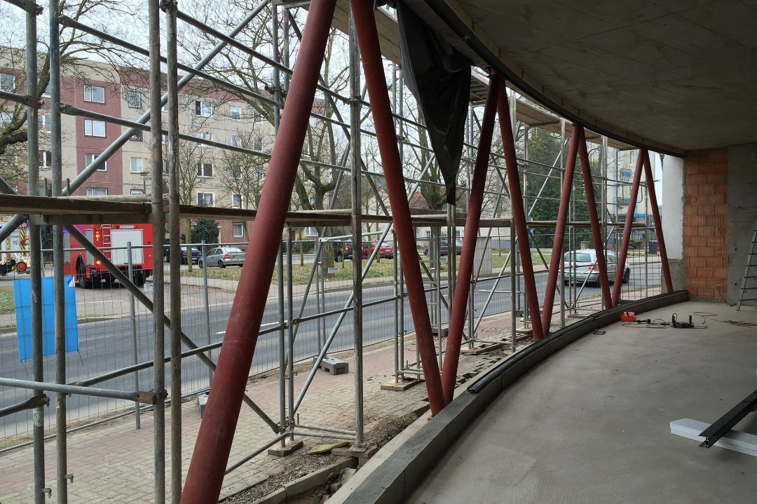 Die Dialogannahme dient nach Fertigstellung als zentraler Anlaufpunkt und Verteiler zwischen Werkstatt, Meistern sowie Wartebereich und bietet den kontrollierten Zugang zum Bestandsgebäude an der Halleschen Straße. Zusätzliche Umbauten im Innern ordnen die Erschließung neu und passen Nebenräume wie Teeküche und WCs aktuellen Anforderungen an.