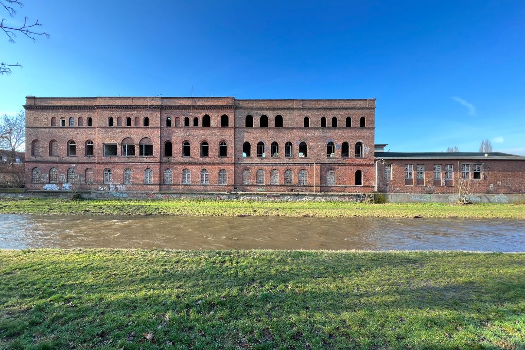 Der ursprüngliche Bau wurde in der Zeit von 1856 bis 1879 zwischen zwei bestehende Gebäude gesetzt. Diese sind längst abgerissen, ihre Lage ist jedoch noch am verbliebenden Anhydrit-Giebelmauerwerk in den in der Nordfassade ablesbar. Beide Anbauten wurden 1910 durch eine Brandwand mit Brandschutztüren getrennt. Die technischen Einbauten wurden zum Teil zwischen 1950 und 1970 demontiert oder fielen dem Verfall zum Opfer.